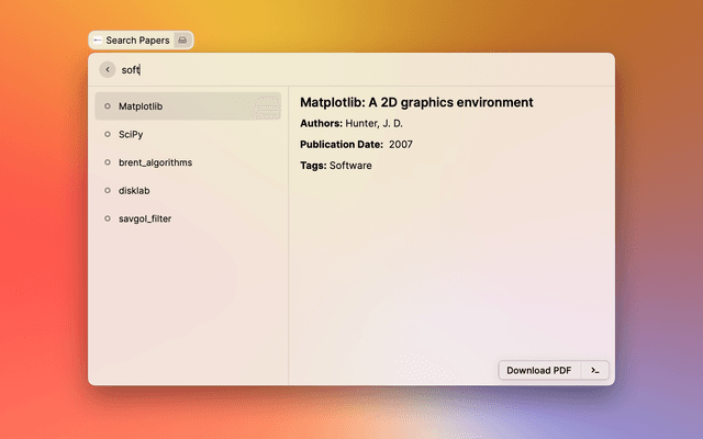 Extension for quickly accessing your bibmanager database from Raycast. Search the database (by bibkey, author, title, year or tags) and quickly access entries by opening or downloading the pdf. You can also open or copy the ADS link and copy the bibtex entry. Make sure to explore available actions in the action panel (⌘ + K).